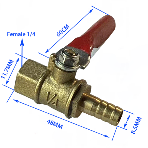 5. Filetage femelle + modèle pagode, une extrémité du produit est un filetage femelle 1/4, avec un diamètre de 11,7 mm, et l'autre extrémité est une tête pagode de 8,5 mm, la longueur totale du corps de la vanne est de 48 mm et la longueur de la poignée est de 60 mm, ce qui convient principalement à l'interface de filetage interne du compresseur d'air et au transfert du tuyau.