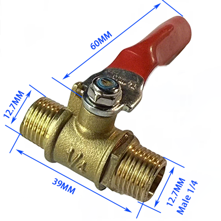 6. Modèle à double filetage externe, les extrémités du produit sont à filetage mâle 1/4, le diamètre est de 12,7 mm, la longueur totale du corps de la vanne est de 39 mm et la longueur de la poignée est de 60 mm, qui est principalement utilisée pour l'amarrage de tuyaux durs du circuit principal du compresseur d'air.
