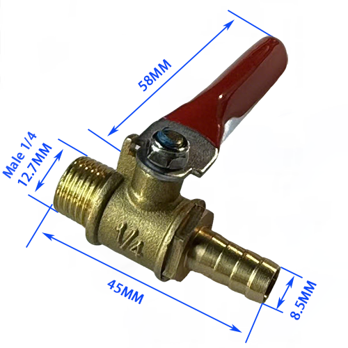 3. Filetage mâle + modèle pagode, une extrémité du produit est un filetage mâle 1/4, avec un diamètre de 12,7 mm, et l'autre extrémité est une tête pagode de 8,5 mm, la longueur totale du corps de la vanne est de 45 mm et la longueur de la poignée est de 58 mm, ce qui convient au transfert de tuyaux et de tuyaux durs, principalement utilisés pour le pipeline de compresseurs d'air et d'outils pneumatiques. Connecter.
