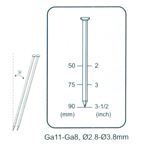Les spécifications des ongles sont GA11-GA8, avec un diamètre de 2,8 à 3,8 mm et des longueurs généralement de 50 mm, 75 mm et 90 mm (2 pouces, 3 pouces, 3-1 / 2 pouces). L'angle d'inclinaison de l'agencement des ongles est de 34 degrés. La profondeur des ongles peut être ajustée en fonction des besoins en travail.