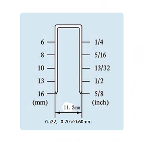FS1016 ARRILLE AIR FINE CROWN ARRAPLER SONT CLASSIQUES Classic à ongles à air lourd. Nail GA22 approprié, 0,75x0,60 mm, distance de l'épaule 11,2 mm, la hauteur des ongles peut être de 6 mm, 8 mm, 10 mm, 13 mm, 16 mm (1/4, 5/16, 3/8, 1/2, 5/8 pouce).