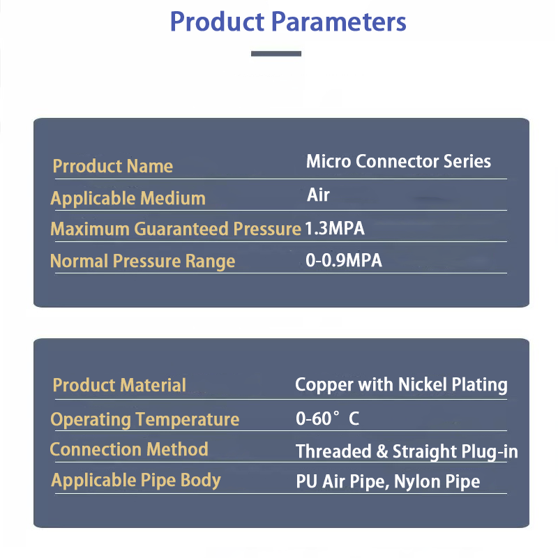 La plage de tolérance de la série Micro Mini Connector elle-même se situe dans la plage de température de 0 à 60 °C. De plus, la pression maximale garantie peut atteindre 1,32 MPa et la plage de pression de service normale est de 0 à 0,9 MPa. Cela couvre entièrement le fonctionnement stable des outils pneumatiques, des vérins automatisés et d'autres équipements nécessitant des conditions de travail à haute pression. La conception de la série Micro Mini Connector peut répondre avec précision aux besoins des opérations industrielles et peut être adaptée aux tubes de trachée en PU et en nylon, qui sont les tubes les plus courants sur le marché. La conception de cette série de produits lui confère une excellente fonction d’étanchéité. À en juger par la conception globale du produit, le matériau du joint est constitué d'un corps de vanne en cuivre nickelé. Le matériau en cuivre nickelé présente non seulement l'excellente étanchéité du matériau en cuivre, mais également la bonne résistance à la corrosion de la couche nickelée, de sorte qu'il peut maintenir le travail même dans un environnement humide ou poussiéreux pendant une longue période. La stabilité de l'ouvrage n'est pas facile à rouiller, ce qui affecte la stabilité de la connexion. L'intérieur adopte une bague d'étanchéité concave spéciale, qui a une plus grande zone de contact, de sorte que l'ajustement est plus élevé et l'étanchéité est plus forte. Dans le même temps, le produit lui-même est conçu avec le filetage R standard du filetage industriel général. Dans le même temps, la combinaison du filetage R standard et du ressort de verrouillage interne évite l'usure et les fuites causées par le desserrage des pièces, ce qui peut ajouter une double protection au travail d'étanchéité, ce qui signifie également que la durée de vie du produit est considérablement prolongée. Enfin, le filetage de la série Micro Mini Connector est pré-enduit de colle PTFE. Le matériau tétrafluoroéthylène lui-même a une très bonne stabilité chimique et un certain pouvoir lubrifiant, ce qui signifie qu'il peut non seulement optimiser l'effet d'étanchéité du filetage, mais également le réduire dans une certaine mesure. Moins d'usure du fil prolongera encore la durée de vie du produit. Du matériau à la conception, la série Micro Mini Connector vise à obtenir une bonne étanchéité, de sorte que dans les conditions de travail à haute pression du système pneumatique, même les travaux à haute fréquence puissent maintenir l'effet d'étanchéité « anti-goutte ».