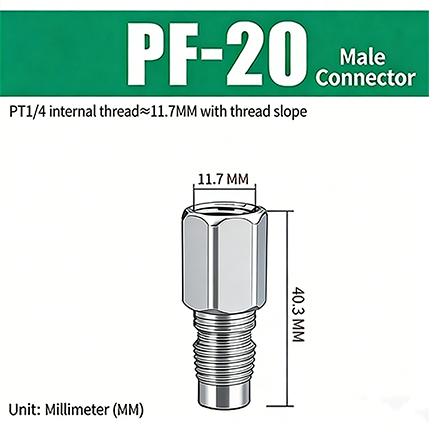 1.PF-20. filetage de tuyau 1/4, avec pente de filetage, le diamètre de la partie filetée est d'environ 11,7 mm et la longueur totale du produit est de 40,3 mm.