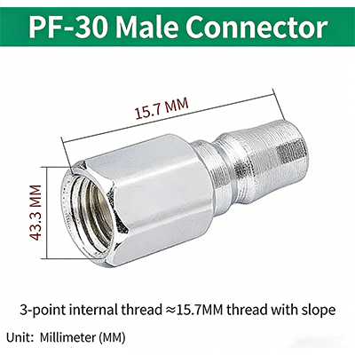 2.PF-30. Filetage de tuyau britannique G3/8", avec pente de filetage, le diamètre de la partie filetée est d'environ 15,7 mm et la longueur totale du produit est de 43,3 mm.