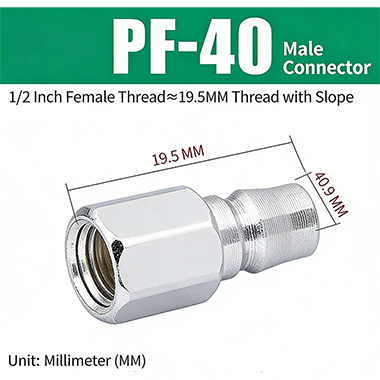 3.PF-40. Filetage de tuyau britannique G1/2", avec pente de filetage, le diamètre de la partie filetée est d'environ 19,5 mm et la longueur totale du produit est de 40,9 mm.