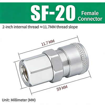 1. SF-20. Le filetage impérial du tuyau est G1/4", le diamètre de la partie filetée est d'environ 11,7 mm et la longueur totale du produit est de 59 mm.