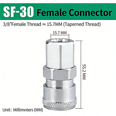 2. SF-30. Filetage interne de 3/8 pouces, le diamètre de la partie filetée est d'environ 15,7 mm et la longueur du produit est de 55,2 mm.