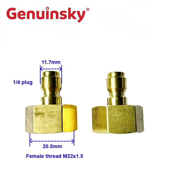 Ce produit est un connecteur de filetage féminin à filetage 1/4 pouce rapide, avec une prise 1/4 à une extrémité, avec un diamètre de 11,7 mm, et un fil féminin M22 × 1,5 à l'autre extrémité, avec un diamètre de 20,5 mm, ce qui convient à l'équipement de nettoyage des lavants à haute pression.