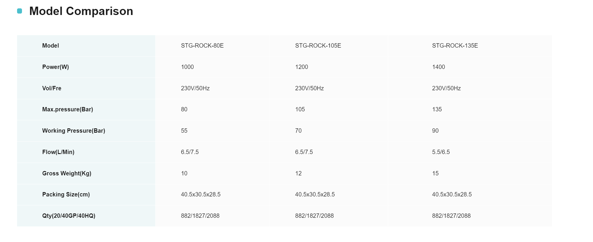 Le nettoyeur haute pression portable STG-ROCK-E est divisé en trois modèles, à savoir STG-ROCK-80E, STG-ROCK-105E et STG-ROCK-135E. Les spécifications d'alimentation électrique des trois modèles sont toutes de 230 V/50 Hz et la taille de l'emballage est également uniformément de 40,5 × 30,5 × 28,5 cm. Le nombre de caissons pour les armoires hautes est également le même. Le nombre de boîtes pour les armoires de 20 pieds de haut est de 882 unités, le nombre de boîtes pour les armoires hautes 40GP est de 1 827 unités et le nombre de boîtes pour les armoires hautes 40HQ. Le nombre de boîtes est de 2 088 unités.