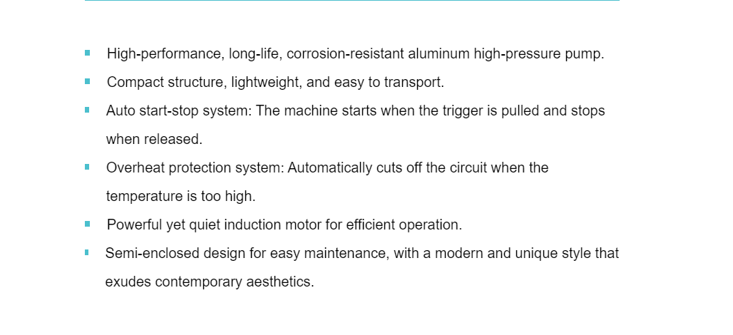 Deuxièmement, le nettoyeur haute pression portable STG-ROCK-K adopte une structure compacte dans son ensemble et le poids corporel global est très léger. Le poids net du K3 est de 10 kg et celui du K4 est de 12 kg, tous deux équipés d'une poignée en haut, ce qui est pratique. Les utilisateurs peuvent se déplacer selon leurs besoins de nettoyage, de la maison vers l'extérieur. Dans le même temps, l'appareil est également équipé de fonctions intelligentes de démarrage/arrêt automatique et de protection contre la surchauffe. Appuyez sur la gâchette du pistolet pulvérisateur pour démarrer et relâchez la gâchette pour arrêter. Aucun interrupteur manuel n'est requis, ce qui rend l'opération plus pratique. La protection contre la surchauffe permet à l'appareil de couper automatiquement le circuit lorsque la température est trop élevée, d'éviter les surcharges causant des dommages à la machine, d'améliorer la sécurité globale et de rendre le produit plus sûr et sans souci pendant l'utilisation. La conception semi-fermée du fuselage est également très humanisée, ce qui est pratique pour l'entretien quotidien et permet de vérifier facilement les pièces et de nettoyer le filtre.