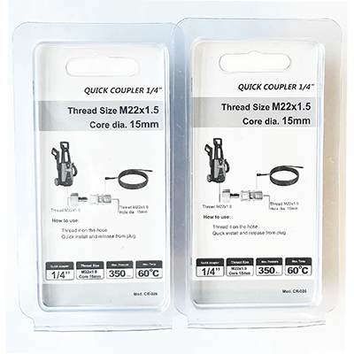Le coupleur 1/4 de ces deux spécifications a des conceptions de tailles différentes. L'un est M22 × 1,5, avec un diamètre de 22 mm, dont le diamètre du noyau est de 15 mm. L'autre est M14×1,5, avec un diamètre de 14 mm et un trou conique. La conception des deux tailles du produit est très précise, qui peut être adaptée avec précision aux machines de nettoyage correspondantes et utilisée pour les connecteurs de tuyaux de pistolets de lavage à haute pression. Le matériau du produit lui-même est du laiton. Le matériau en laiton présente une bonne résistance à la corrosion. Les travaux de nettoyage haute pression doivent souvent faire face à un environnement humide. Par conséquent, la résistance à la corrosion du produit lui-même peut fonctionner normalement dans de nombreux environnements de travail difficiles. Dans le même temps, le laiton a une bonne ductilité et dureté, et dans un débit d'eau à haute pression, la durabilité du produit lui-même peut également être maintenue sous l'impact, et il n'est pas facile à casser, provoquant ainsi des fuites d'eau et réduisant le coût de remplacement de l'équipement. Les scénarios d'utilisation courants incluent le nettoyage de la maison, le nettoyage des équipements industriels ou le nettoyage des installations extérieures. Au cours de ces processus de nettoyage, l'installation ou le démontage peuvent être effectués rapidement. Les utilisateurs peuvent terminer rapidement le travail de connexion sans l'aide d'outils, ce qui améliore considérablement l'efficacité du travail et fait gagner du temps. Dans le même temps, la taille du coupleur 1/4 de ces deux spécifications est également très appropriée. Les utilisateurs peuvent effectuer l'opération de connexion facilement et de manière flexible d'une seule main.